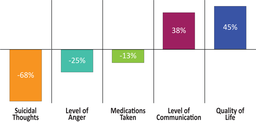 Service dogs are making a real impact on the lives of our Veteran clients with military-connected PTSD. Operation Freedom Paws Post-Program Survey results from a group June 2020 documented significant decreases in suicidal ideation, levels of anger, and amount of medication being taken. The survey, completed by 75 Program graduates, also showed a self-reported increase in the level of communication and quality of life.