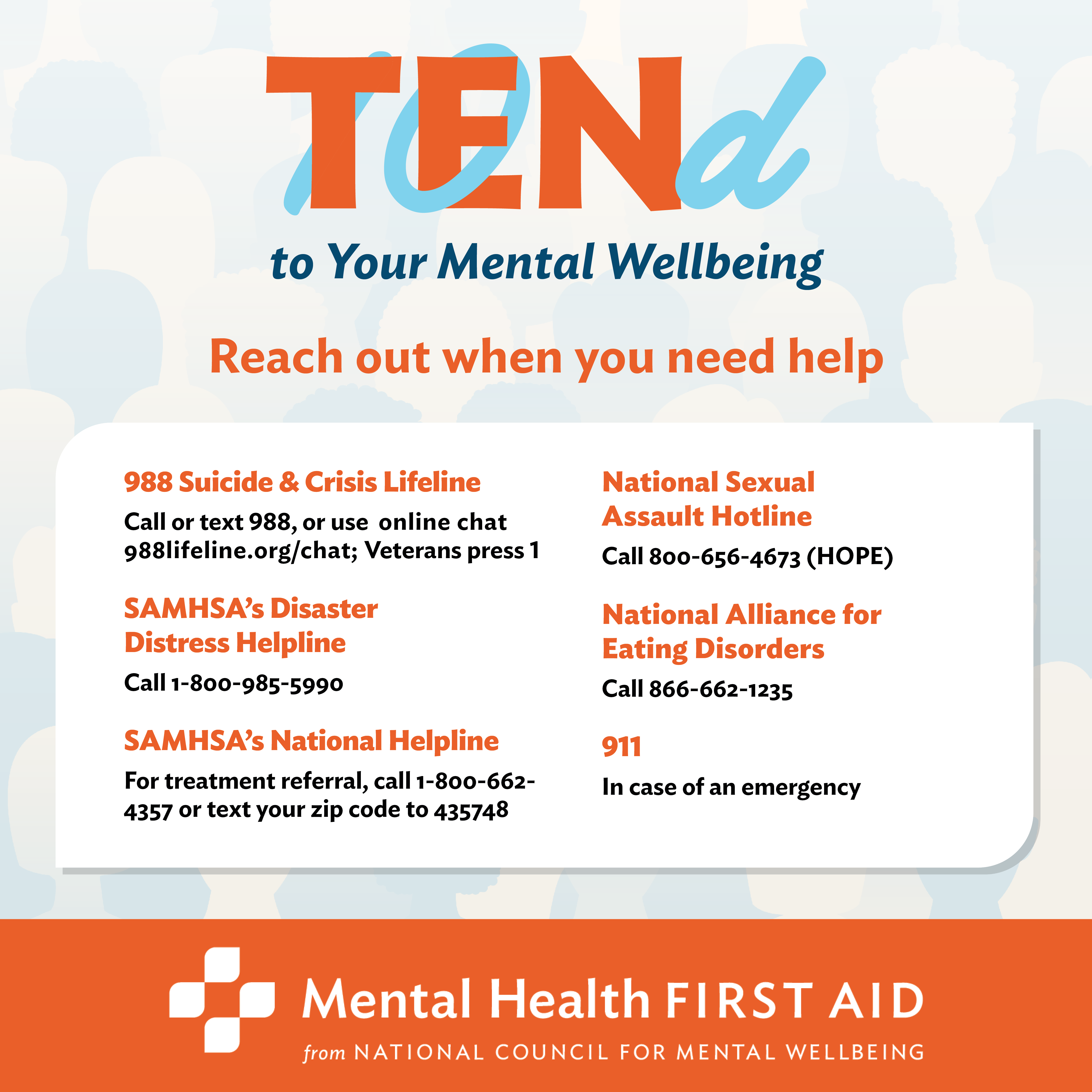 In addition to operating MHFA, the National Council for Mental Wellbeing represents more than 3,400 community-based mental health and substance use providers nationwide. Every day, the National Council works to ensure equitable access to high-quality mental health and substance use treatment services, build the capacity of mental health and substance use treatment organizations, and promote a greater understanding of mental wellbeing as a core component of comprehensive health and health care. Learn about the National Council’s priorities. - Stay informed for opportunities to add your voice to the conversation.