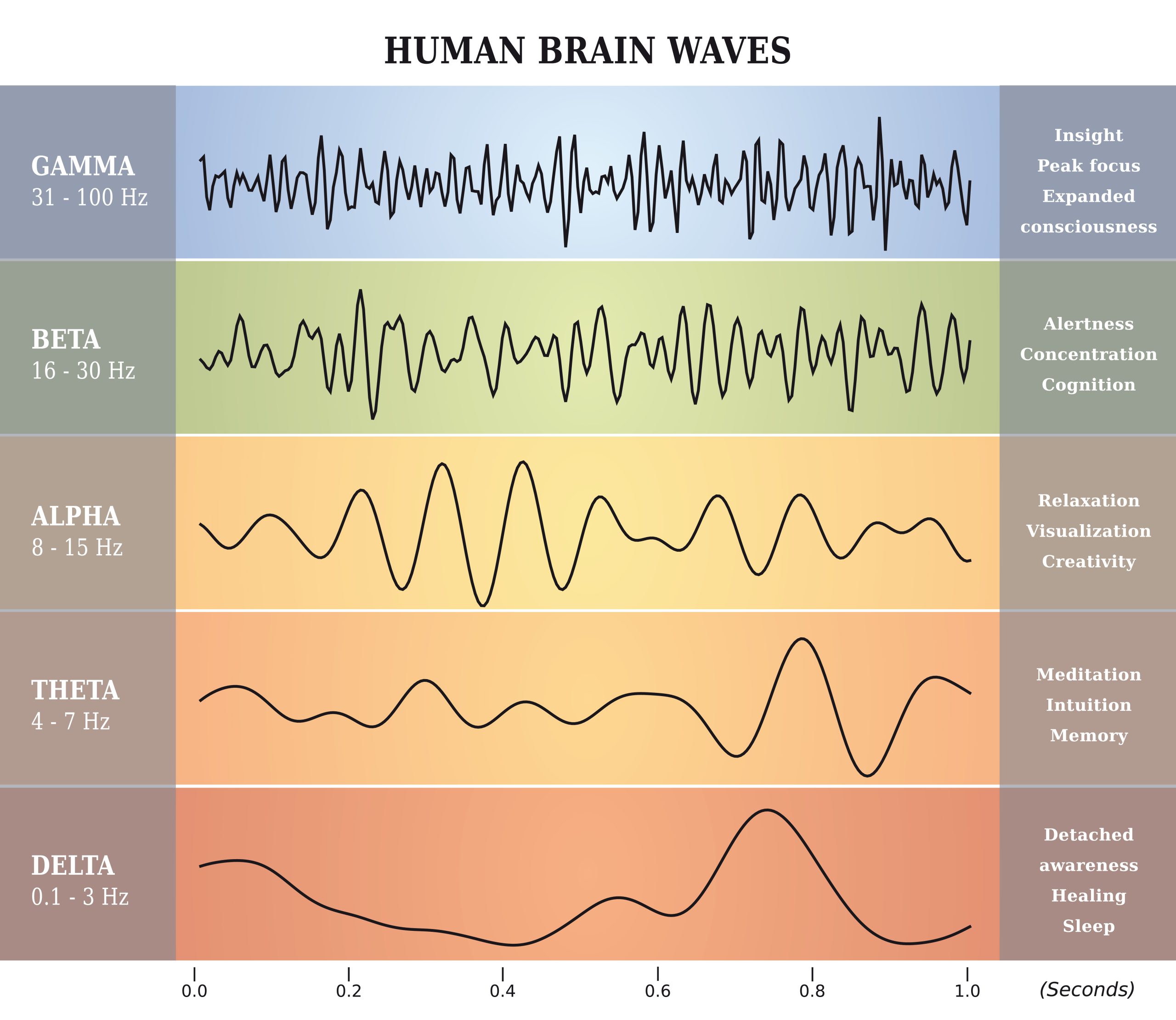 Activity in the different brain wave frequencies influences how we feel. For example, when we are sleepy and drowsy, or in deep sleep, there is more activity in the delta wave frequencies. When we are alert, concentrating, and focused, the gamma wave frequencies are more active. However, we can also influence our brain wave activity by our activities and efforts. By learning to relax, for example through meditation, yoga, mindfulness exercises, we increase the activity in the alpha wave frequencies, which facilitates the “alpha state” feeling of being calm, relaxed. During this state, our heart rate variability (HRV) improves, muscle tension decreases, breathing becomes slower and steadier, and we feel at ease and at peace.