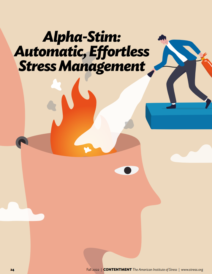 On the whole, we are more stressed and worried than any point in history, and getting worse each year. The most commonly used stress management techniques require additional effort and time set aside to practice in order for them to become effective. Scheduling this time and putting forth this effort can seem overwhelming to a person who is already experiencing high levels of stress and worry. In contrast, Alpha-Stim can be used during the normal course of our daily schedules, without disrupting our routines or requiring us to practice and learn new skills and techniques. This safe and easy to use device automatically induces an alpha state and activates the parasympathetic nervous system, which results in feeling relaxed and calm. You can learn more at www.alpha-stim.com.