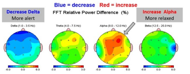 Once these frequencies enter the nervous system, many changes occur within the brain. There are effects to the adrenaline, serotonin, and cortisol pathways. There are immediate brainwave changes that can be measured by an EEG. The most notable change in brain wave activity is the induction of an alpha state, which is a range of alpha brain wave activity associated with feeling relaxed and calm. It is the same brain wave activity that can be observed by people who practice meditation regularly. In addition, there are changes to delta wave activity, especially in the frontal lobe right behind the eyes and forehead. Delta waves are associated with feelings of drowsiness and sleep. In general, an Alpha-Stim treatment results in an increase in alpha wave activity and a decrease in delta wave activity,4 leaving the user feeling calm and relaxed, while at the same time alert and focused (See Figure 2).